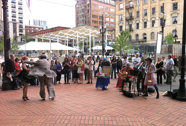 I started The Big Busk mostly as a bet. A friend and I were wandering Last Thursday, which started as an art walk similar to the First Thursday event in downtown Portland but has evolved into something more like a gigantic street fair. Imagine dozens and dozens of bands, jugglers, stilt walkers, hula hoopers, curbside acrobats, and sundry synchronized hippie demonstrations scattered over fifteen blocks with thousands of people of every age wandering like water all around them. At the time I was living in downtown and I wanted to bring a little of that down there with me. So I told my friend we should organize a street music event. He told me good luck. Six weeks later we had our first Big Busk.